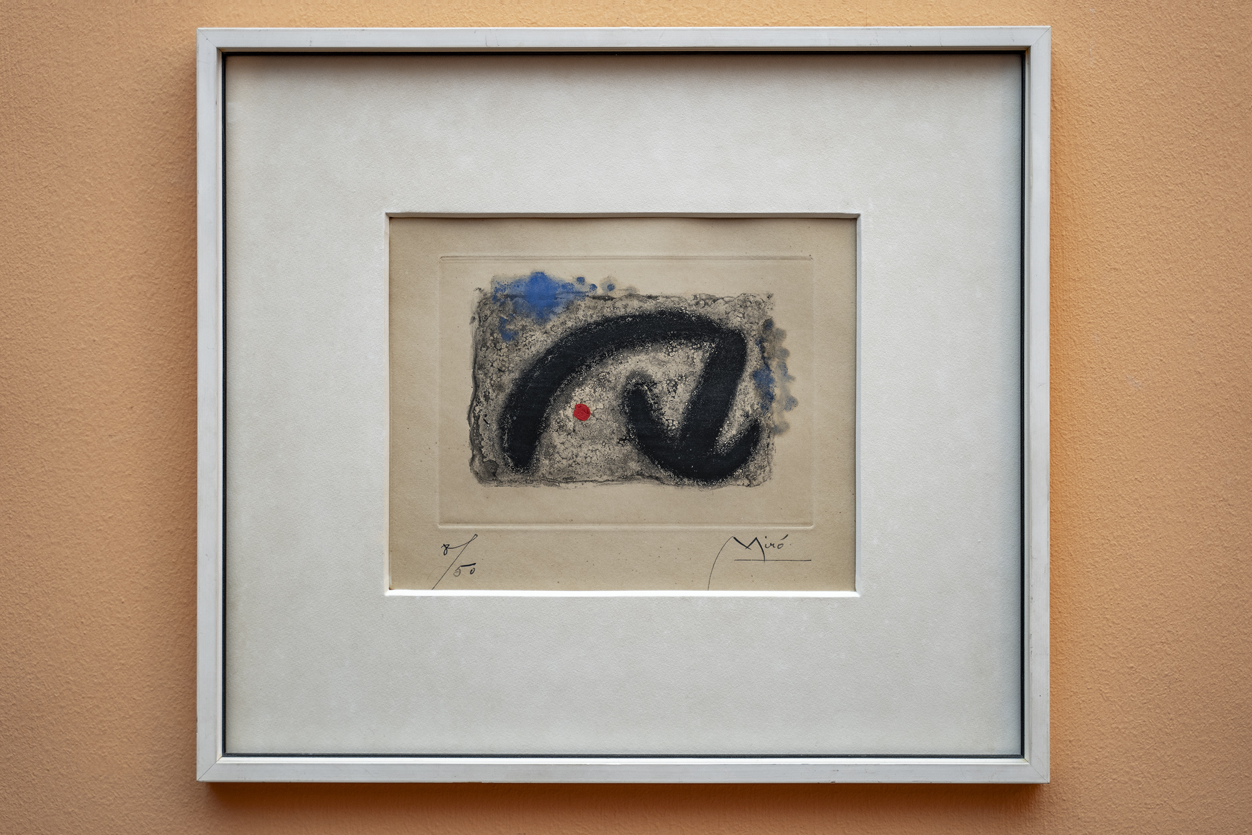 Buchillustration zu René Char. Aus der Mappe “Fusées”, herausgegeben von Louis Broder, Paris 1959. (Gebräuntes, lichtschattiges Papier, leicht ausgeblichen, Montageflecken am oberen Papierrand)